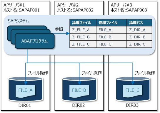 物理ディレクトリパスを変数として定義することができるため、ジョブやABAPプログラム、汎用モジュールなどで直接物理ディレクトリのパスを記述せずに論理名を記述することで、環境の違い ( 本番機、品証機、開発機など ) を区別する必要がなくなります。