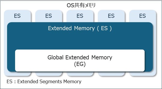 連続したメモリセグメントで構成されており、セグメントは1つ以上のブロックで構成されてます。拡張セグメントメモリは全てのワークプロセスからアクセスが可能となります。ユーザコンテキストが拡張メモリからメモリ領域を要求すると、拡張セグメントメモリから1つ上のブロックが拡張メモリに割当られます。