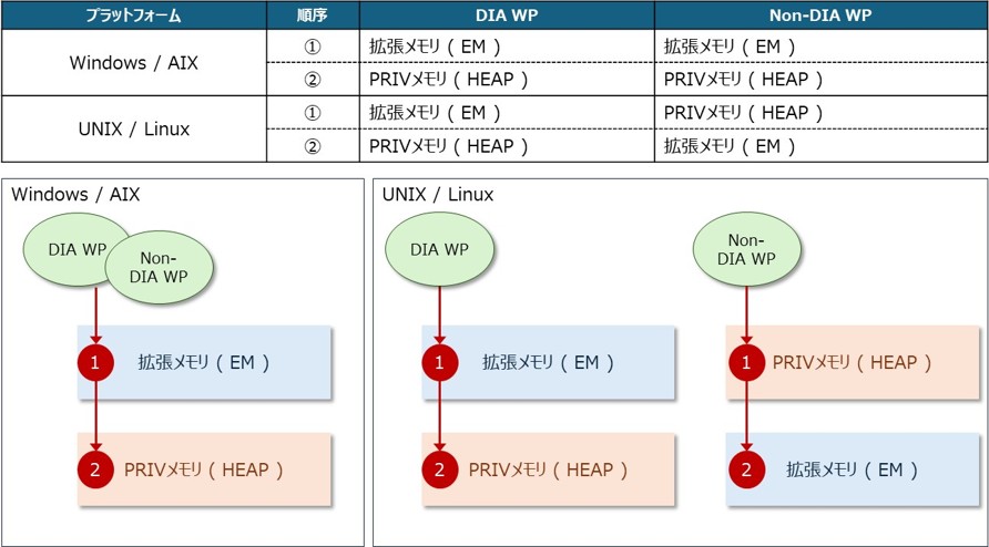 SAPシステムでは、SAPアプリケーションサーバインスタンスが実行されているプラットフォームによって、ワークプロセスが使用するメモリタイプの順序が異なります。また、ダイアログワークプロセスと非ダイアログワークプロセスでも使用するメモリタイプの順序が異なります。