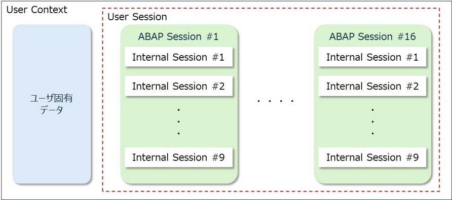 ユーザセッションにはABAPセッションと呼ばれる領域が作成されます。このABAPセッションはSAPGUIで「新規GUIウィンドウ」ボタンを押して、複製されたセッションごとにABAPセッションが作られます。ABAPセッションにはSAPGUIセッションのデータが格納されます。