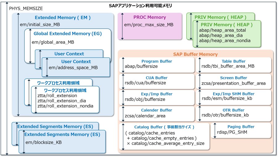 ゼロ管理メモリ管理では、SAPパラメータ「PHYS_MEMSIZE」の設定値を基準に拡張メモリの各SAPパラメータの設定値が自動で計算されるようになります。PRIVメモリ ( ヒープメモリ ) は自動計算の対象外となります。