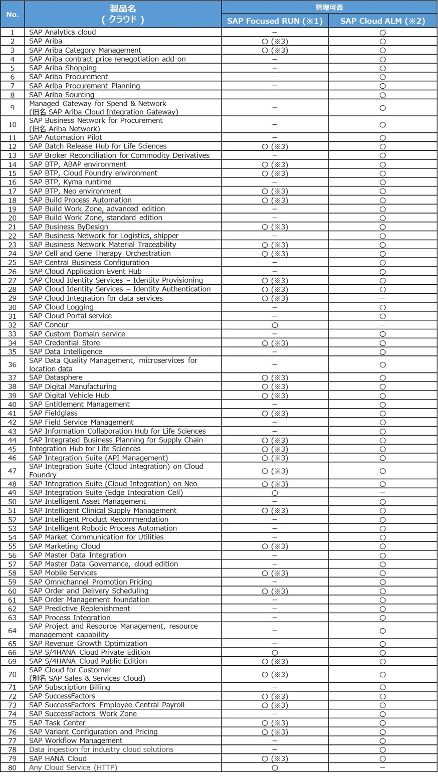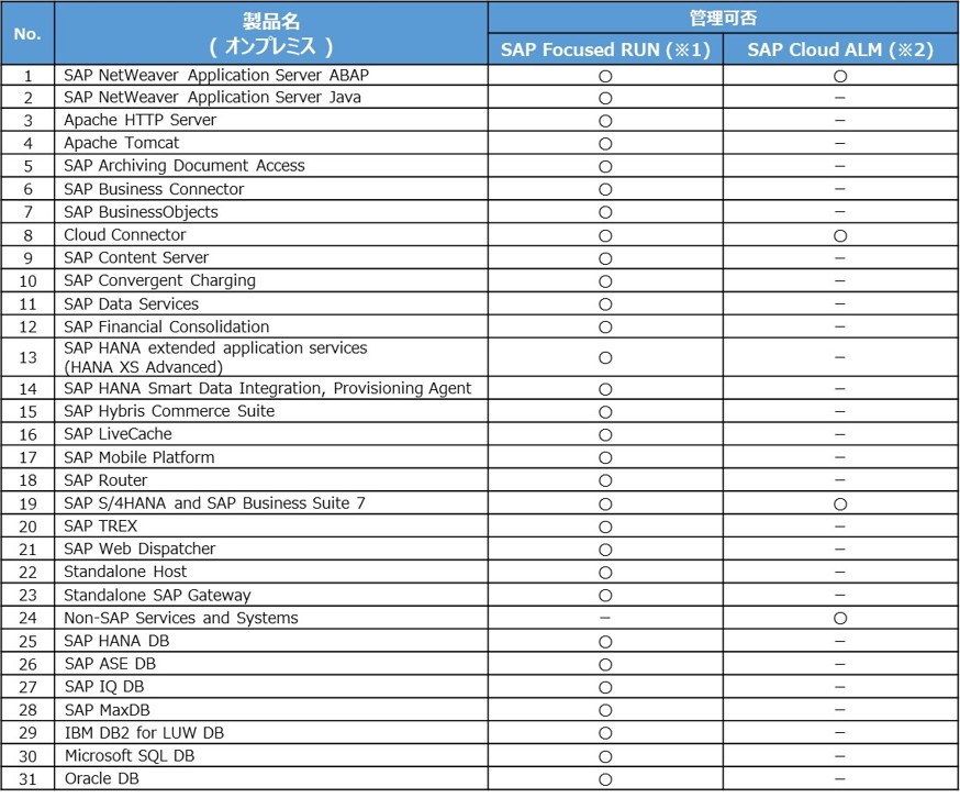 上記の通り、FRUNはオンプレミス製品が多くサポートされており、SAP Cloud ALMはクラウド製品が多くサポートされています。