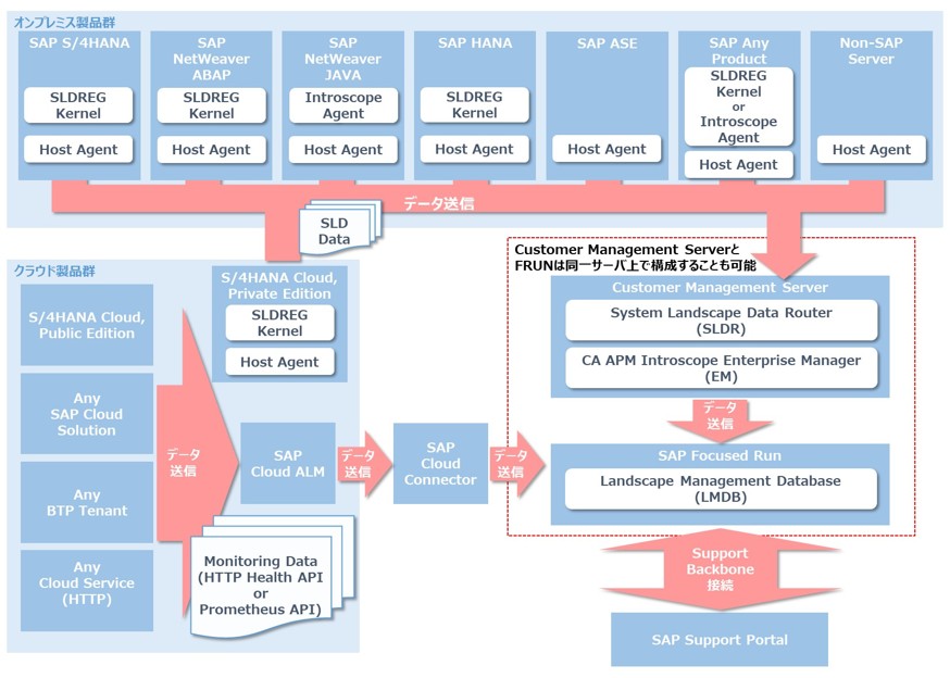 オンプレミス製品の場合、各サーバのHost AgentやSLDREGカーネル、Introscope AgentなどがSLD DataをFRUNのLandscape Management Database ( LMDB ) に送信します。