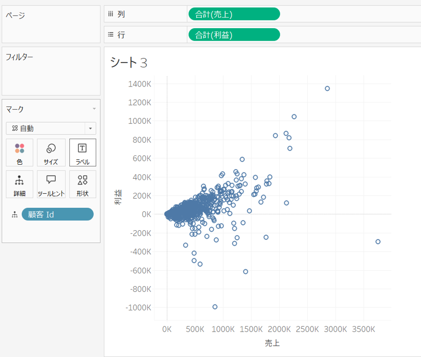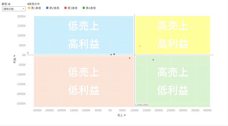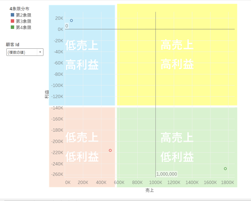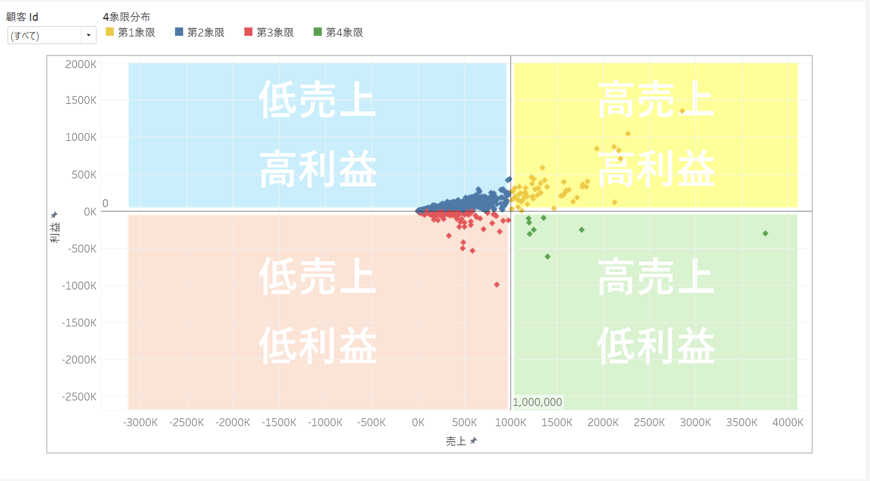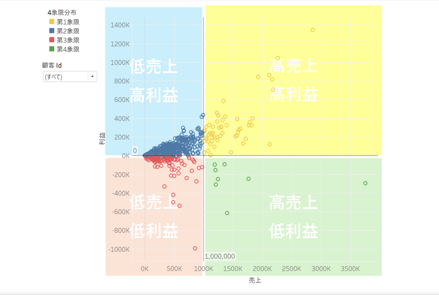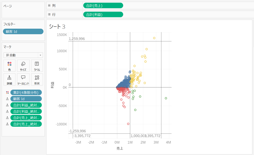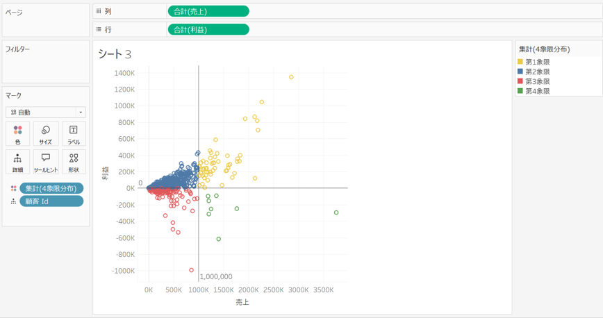 作成した計算フィールドを色に配置することで、4象限チャートを作成することができます。